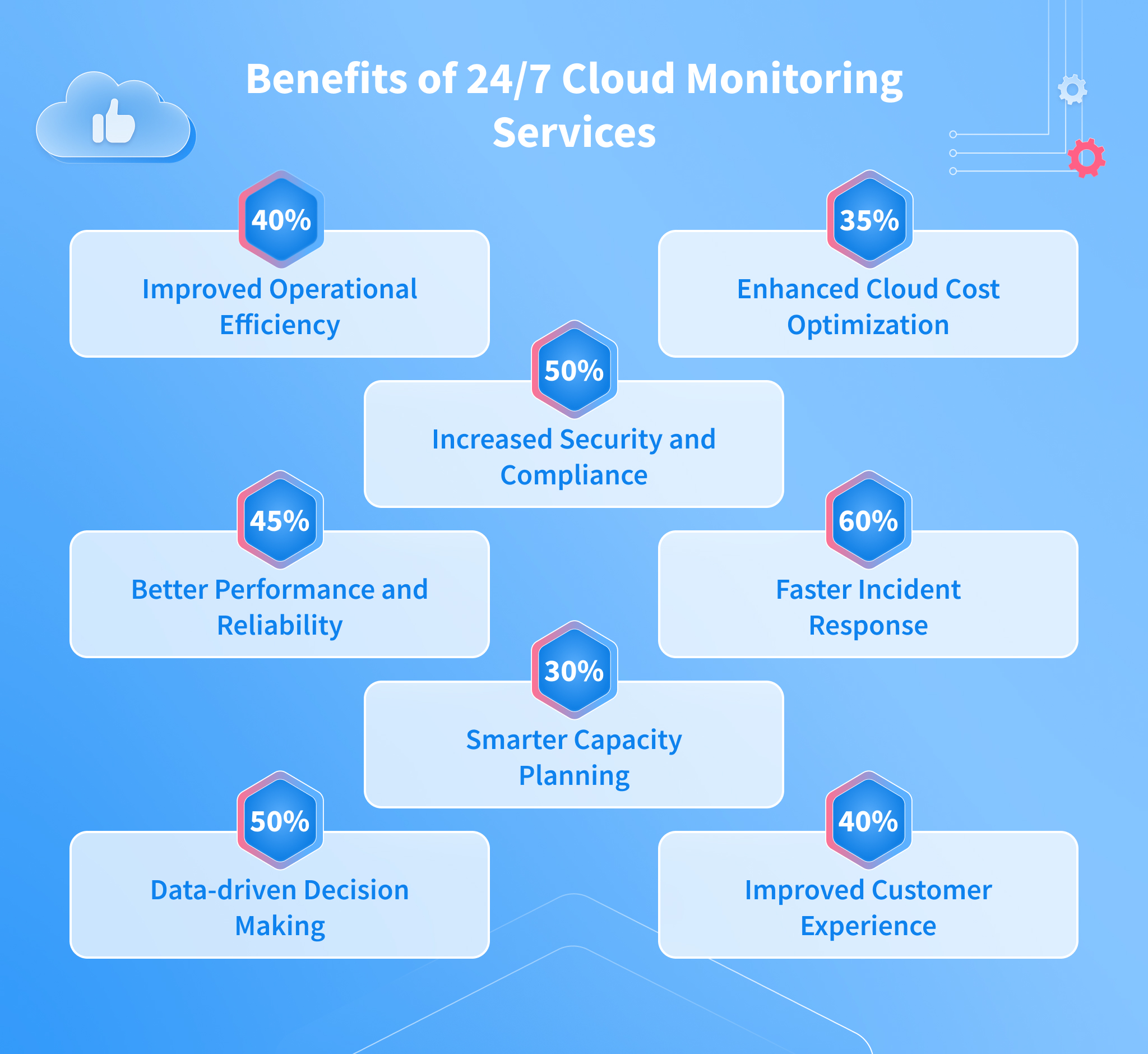 By ensuring seamless performance and uptime, cloud monitoring strengthens customer satisfaction and trust.Example: Continuous cloud infrastructure monitoring ensures high-speed transaction processing for e-commerce customers.