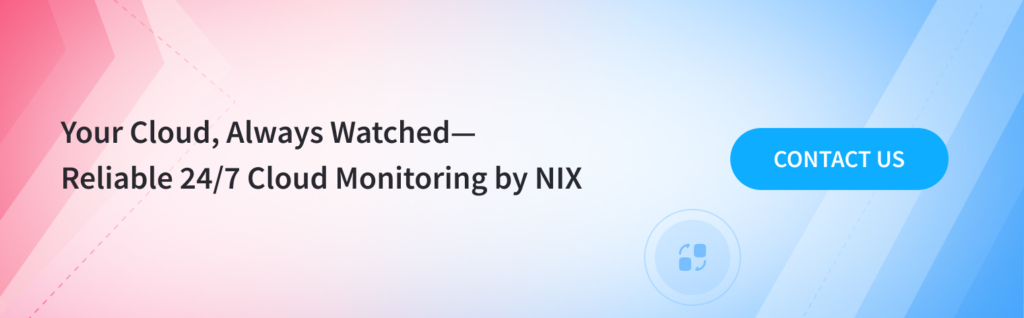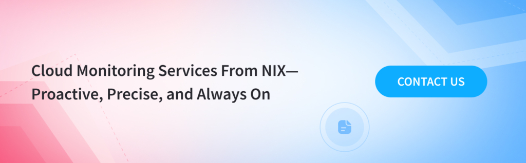 Monitoring cloud environments effectively — whether native, hybrid, multi-cloud, private, or edge — requires expertise, the right tools, and a strategic approach. At NIX, our certified cloud consultants use cutting-edge technology and proactive monitoring solutions to provide complete visibility, ensure optimal performance, and deliver valuable insights that keep your business running smoothly. With NIX as your trusted service provider, you can maintain efficiency, optimize cloud spend, and confidently navigate your digital transformation in the cloud. Contact us to optimize your cloud monitoring strategy already now.