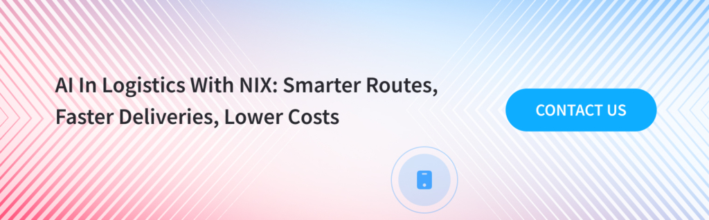The potential of AI in logistics is no longer a distant vision — it’s becoming an operational reality that reshapes the entire supply chain. How is AI improving logistics? By enabling smarter decision-making, reducing inefficiencies, and increasing agility in an increasingly complex market. From dynamic route planning to predictive maintenance, what is an example of AI in logistics? The answer lies in AI-powered tools that streamline operations and transform customer experiences. Understanding AI vs ML vs DL is crucial for leveraging the right technologies, while AI agents for enterprises offer scalable solutions that integrate seamlessly with existing workflows. However, adopting AI successfully requires not only the right tools but also deep expertise. That’s why partnering with NIX — a trusted, experienced tech partner — is invaluable. With our deep knowledge of AI-driven solutions and logistics best practices, we help businesses navigate complexity, maximize ROI, and confidently embrace the future of AI-enhanced logistics.
