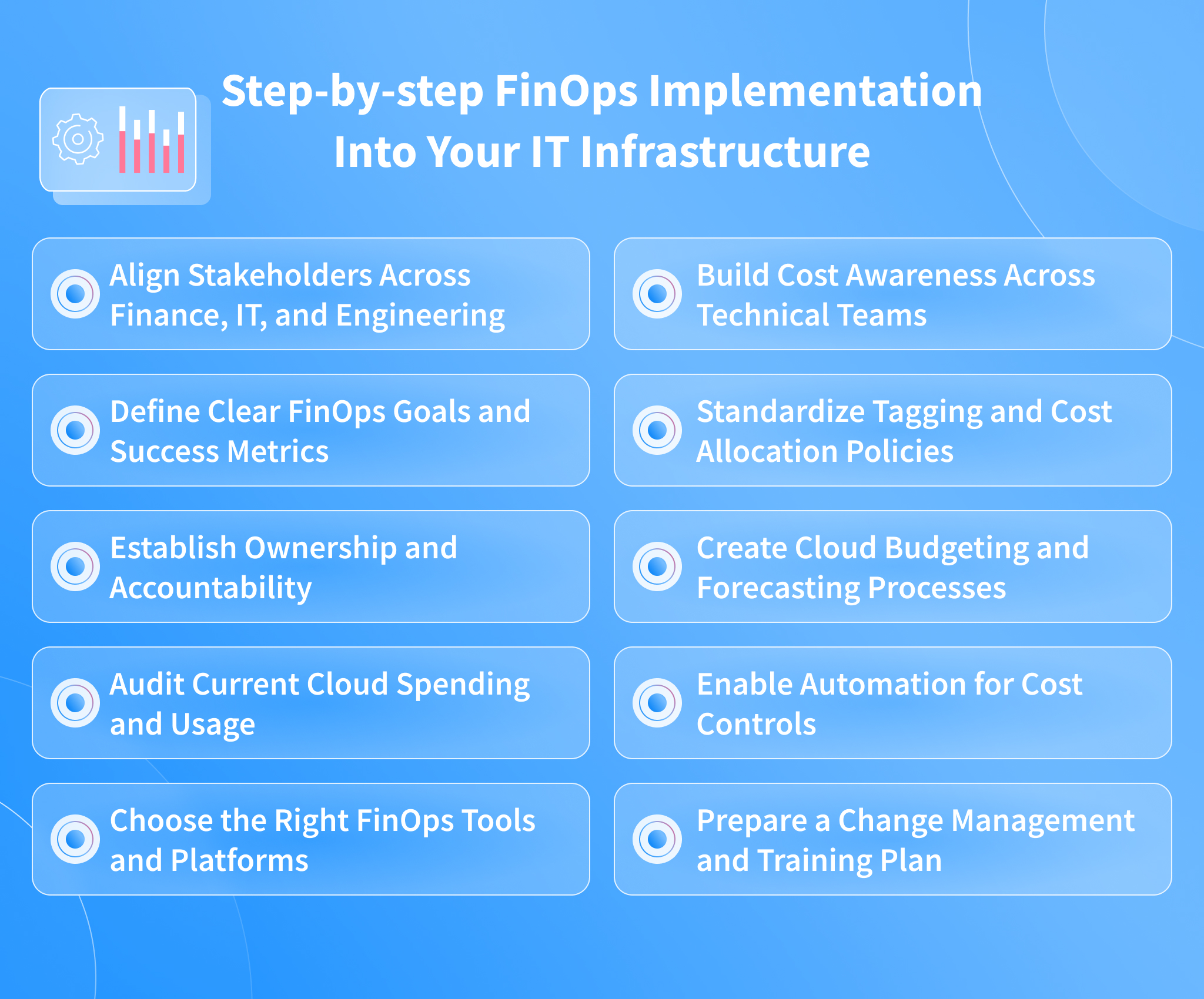 Successful implementation of cloud FinOps is not just about adding new monitoring tools—it requires building structured processes, shared accountability, and clear financial visibility across your IT infrastructure. Based on real-world project experience, companies that approach FinOps step by step achieve faster results, better cost transparency, and improved control over the total cost of ownership (TCO). Below is a practical roadmap that helps organizations introduce cloud FinOps without disrupting existing operations.