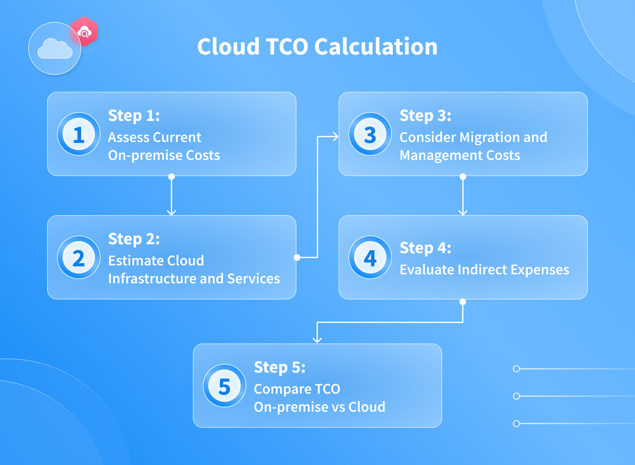 The cloud total cost of ownership comprises the assessment of your current traditional environment, cloud costs, including the expenses associated with migration, and intangible costs. The latter describes hidden costs like opportunity and elasticity or downtime and slower speeds. Lastly, compare on-premise vs cloud TCO over a certain period of time, typically five years, to identify which scenario is more lucrative.
