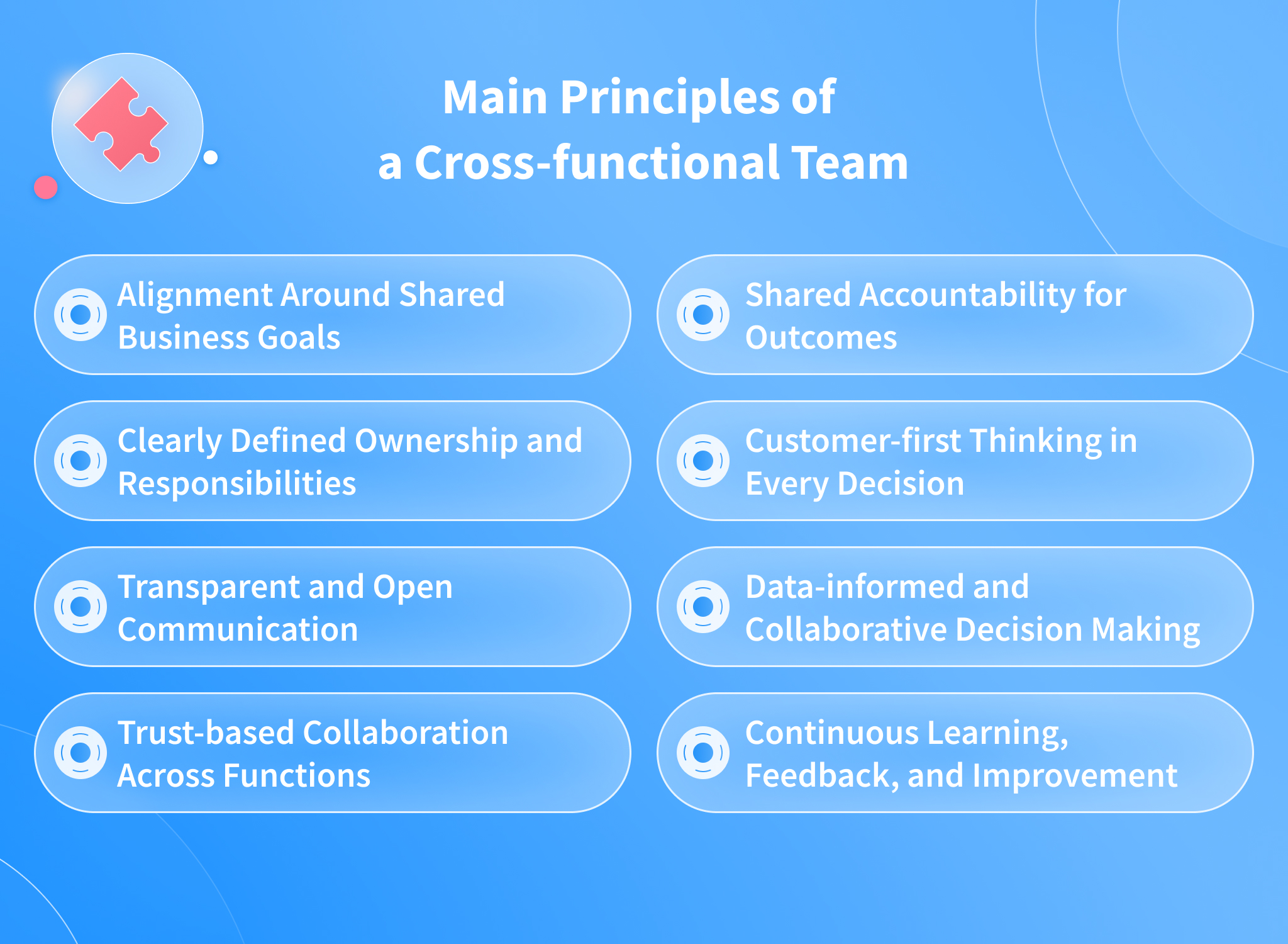 A strong cross-functional team structure is not defined only by roles, but by principles that guide daily behavior and decision-making. Whether delivering web application development, implementing system integration services, or optimizing a RevOps workflow, successful cross-functional team examples consistently rely on practical, repeatable behaviors — not just theory.