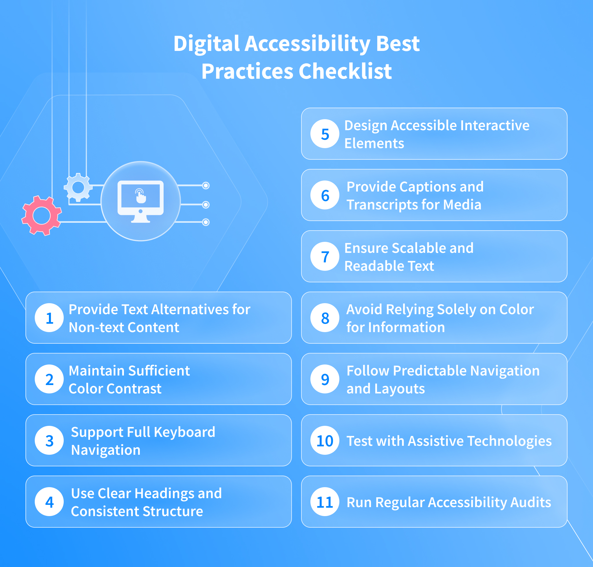 Regularly validate websites and applications using screen readers, voice commands, keyboard-only navigation, and other assistive tools. Combine automated testing tools with manual checks to identify accessibility gaps. Testing ensures users with disabilities can interact with content as intended and that new features do not introduce barriers. Conduct periodic accessibility testing and QA and schedule comprehensive accessibility audits to maintain compliance, improve digital accessibility, and continually refine your user experience.