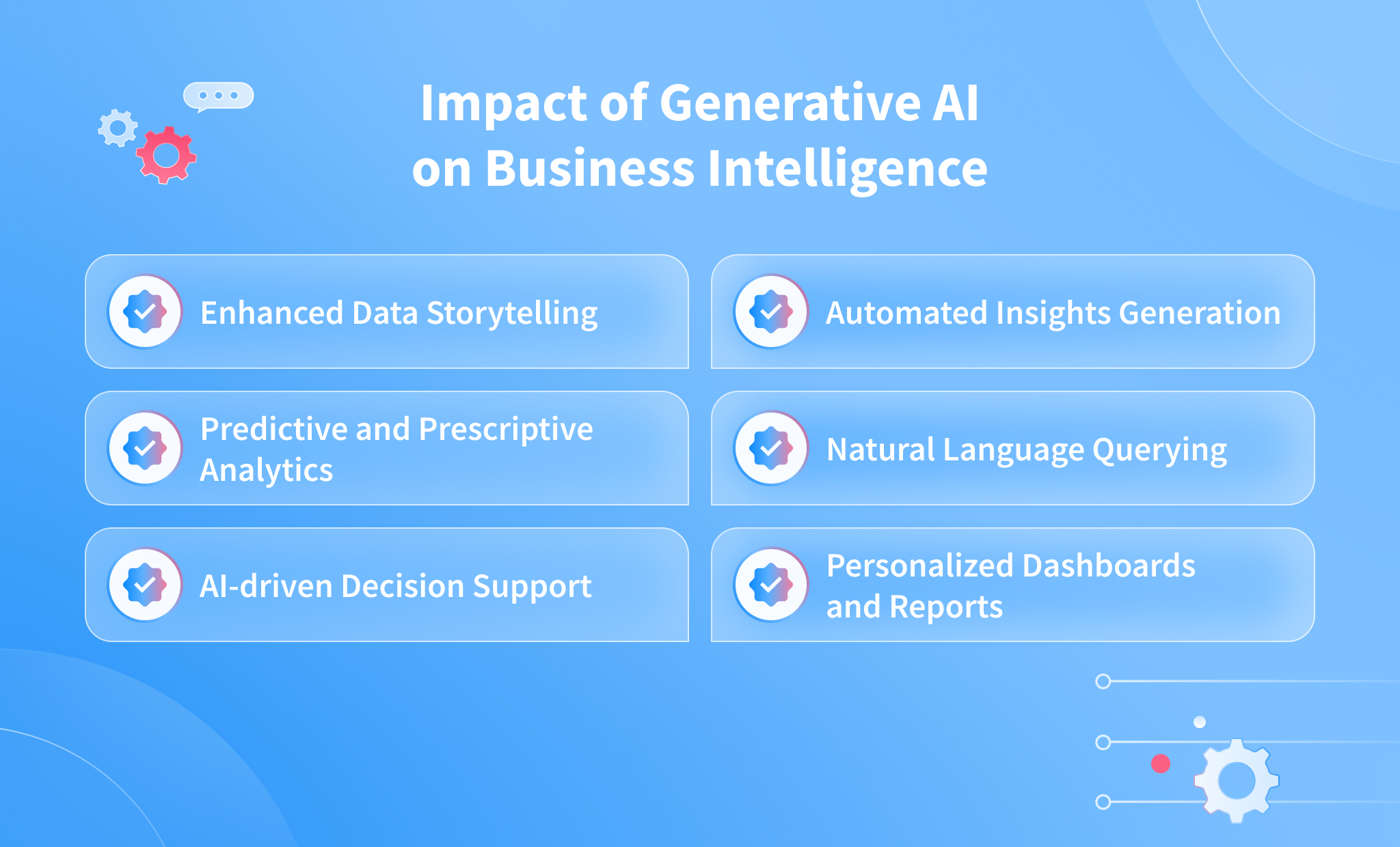 So, how can AI solve the aforementioned limitations? In this section, we’ll concentrate on artificial intelligence, discuss what AI in BI means, and discuss the impact of generative AI on business intelligence.