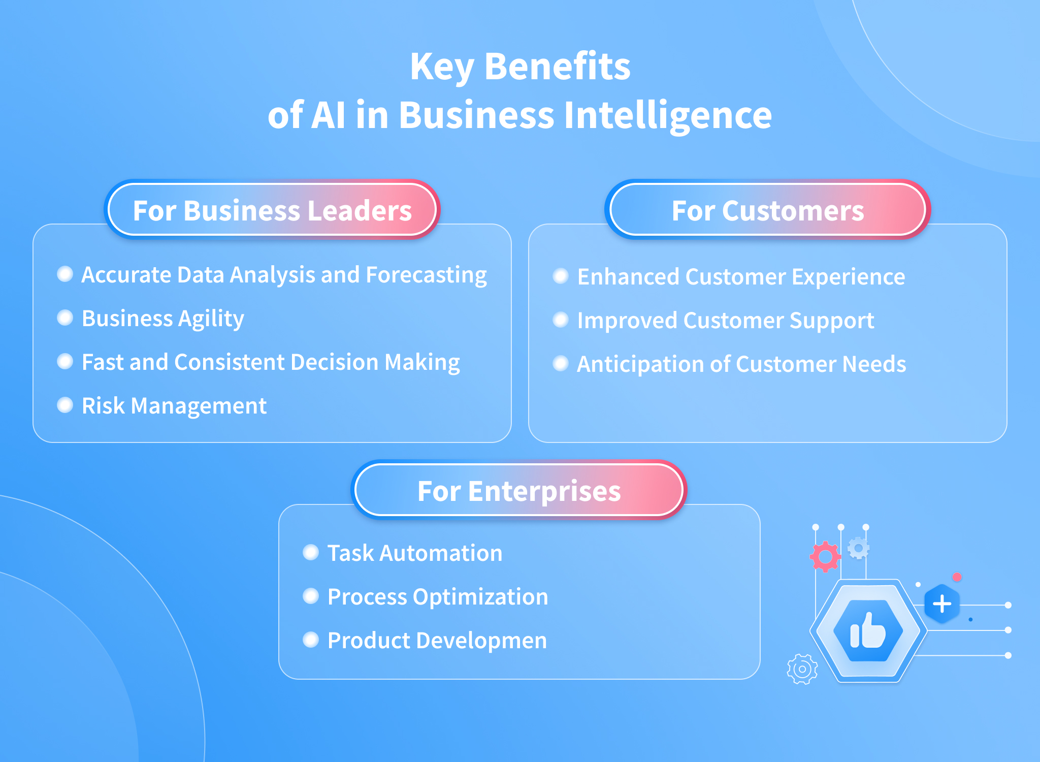 As a business leader, you’d likely want to learn what benefits you’ll unlock if you implement an enterprise BI platform. In this part, we’ll focus on the benefits of AI in business intelligence for business owners and stakeholders, for companies and employees, and for customers.