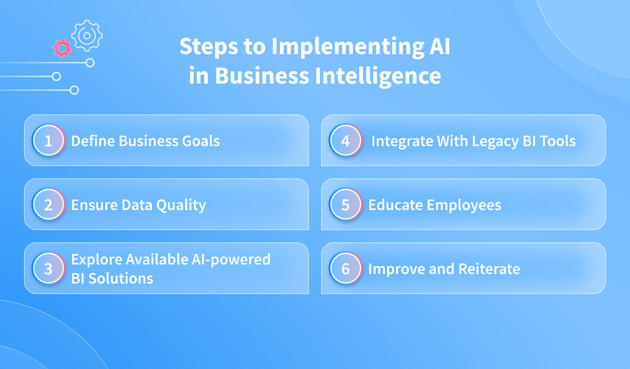This step is likely to require technical acumen and domain understanding to ensure that your existing BI systems seamlessly integrate with AI-powered tools. If lacking in-house expertise, consider hiring an external agency to help in this complex process.