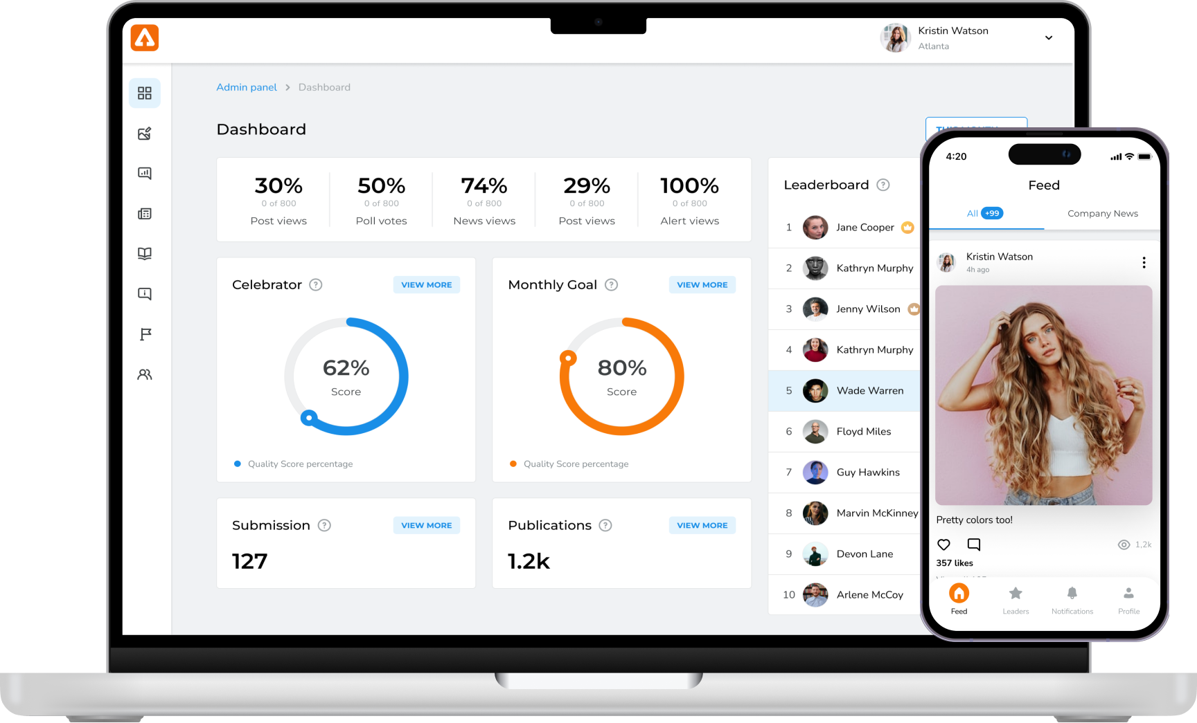 Every user within the app has a score based on internal activity. Admin allows custom score configuration to increase user engagement.