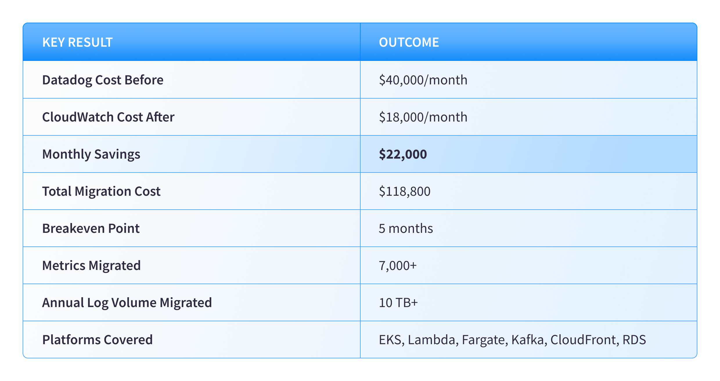 By replacing high-cost legacy tooling with a unified AWS-native strategy, the enterprise reclaimed control over its global infrastructure margins. The transition delivered an immediate 45–55% reduction in monthly observability spend, effectively eliminating over $240,000 in annual observability costs.