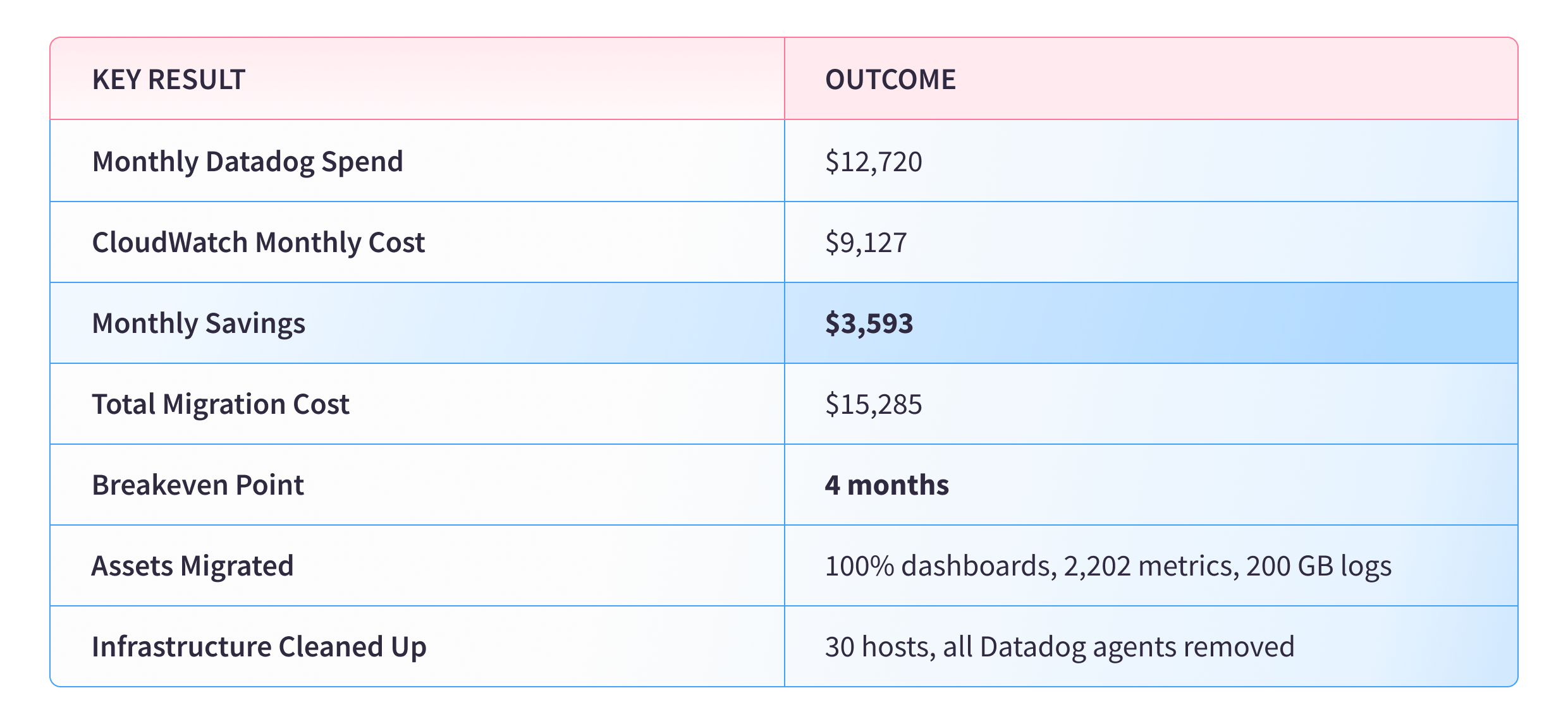 Following validation, our seasoned experts implemented a series of CloudWatch cost optimization techniques, fine-tuning retention tiers, logging routing efficiency, and metric filters. This final optimization enabled the clean decommissioning of Datadog agents and a full migration to AWS-native monitoring, drastically reducing observability costs.